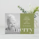 O cartão de Natal moderno apresenta um tipo de feliz ousado num fundo verde de tendência com uma simples mensagem e fotografia de feriado de tipografia branca.