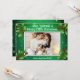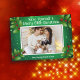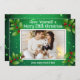 Tenha um cartão de Natal feliz, com modelo de foto. Personalize o texto no topo e assine na parte inferior. Carta verde das estrelas piscando. A foto horizontal é emoldurada em branco e decorada com folhas ocas.