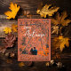 Um estilo moderno e uma tipografia minimalista para esta escrita branca" Feliz outono". Você também pode mudar facilmente a cor da fonte ou da foto para seu gosto. com uma mensagem de outono no verso.