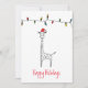 Ilustração de girafa branca e negra com chapéu vermelho de Papai Noel, uma sequência de luzes de feriado e texto personalizável de "Feriados Felizes"