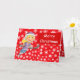 Design da frente: Neve branca em fundo vermelho + menina jogadora de hóquei + texto 'Feliz Natal' em branco sobre vermelho