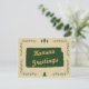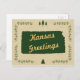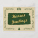 Um tema da natureza rústica inspirou design. O estado do Kansas esboçou-se numa cor verde-florestal. O texto diz saudações do Kansas, mas você pode personalizá-lo com seu próprio texto. A borda é um galho foliar com alguns sotaques de pinheiros em cima e em baixo. O fundo é uma cor kraft castanha clara com textura de marca d'água floco de neve. Personalize estes cartões para a época de Natal. São também excelentes para uso geral.