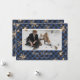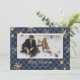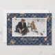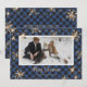 Cartões de Natal bonitos de xadrez azul de dois lados, com flocos de neve brilhantes e estrelas com título de caligrafia e quadro fotográfico. Um texto personalizado com flocos de neve cintilantes e estrelas em um fundo de xadrez de búfalo azul no fundo.