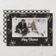 Cartões de natal bonitos de xadrez preto e branco de dois lados, com flocos de neve cintilantes e estrelas com título de caligrafia dourada e quadro fotográfico. Um fundo de xadrez de búfalo preto e branco nas costas.