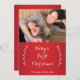 Cartão de Natal do Primeiro Natal do Bebê Vermelho para feriados com texto e foto mutáveis - você pode adicionar sua foto, nome da família e ano e sua mensagem de Natal no verso do cartão. Está disponível como cartão de feriado impresso ou como download instantâneo.