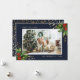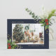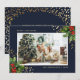 Cartões de Natal com uma foto azul escura, com foto de cor azul escura, decorados com ilustrações de cor d'água de holly com bagas e faux gold foil confetti. Personalize facilmente esses Cartões de foto de Natal azuis com sua imagem e seu texto.