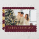 Foto moderna de folha vermelha e dourada Cartão de Natal Merry com tiras de folha de ouro vermelhas e sujas, com neve caindo nas costas e uma foto na frente. Personalize facilmente este cartão de feriado elegante com sua foto e texto.