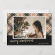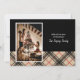 Feliz Natal! Placa plana horizontal fotográfica personalizável com xadrez preta, bege e vermelha e tipografia de script na frente. Personalize adicionando 2 de suas fotos favoritas, nomes na frente e sobrenome atrás. Consulte nosso site para ver mais cartões de Natal e ideias de Natal—> www.tkmpartyprintables.com