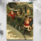 Belos natais vintages Treinam cartão-postal. "Cartões de natal" escritos no canto inferior esquerdo. Este design apresenta um condutor de trem do Papai Noel com duas crianças pequenas pegando carona na frente do trem.