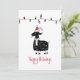 Ilustração de cabra branca com chapéu vermelho de Papai Noel, uma sequência de luzes de feriado e texto personalizável de "Feliz Feriado"