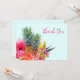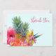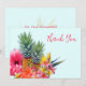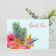 Notas de agradecimento de flores tropicais e abacaxi. Cartões azuis pálidos e planos com flores havaianas na frente. Hibisco, plumeria / frangipani e flores de ave-do-paraíso fazem parte do design com dois abacaxis no centro das flores. Modelos de texto rosa brilhante na frente e verso são fáceis de personalizar conforme necessário. Inclua uma mensagem e assinatura no verso sobre um fundo floral de ave-do-paraíso.