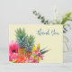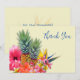Notas de agradecimento de flores tropicais e abacaxi. Cartões planos amarelos pálidos com flores havaianas na frente. Hibiscos, plumeria / frangipani e flores de ave-do-paraíso fazem parte do design com dois abacaxis no centro das flores. Modelos de texto azul escuro na frente e verso são fáceis de personalizar conforme necessário. Inclua uma mensagem e assinatura no verso sobre um fundo floral de ave-do-paraíso.