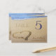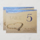 Coração em cartões de mesa de areia. Assentos na recepção de casamento usando cartas românticas, de praia, de dois lados, achatadas. Ambos os lados são decorados com um coração desenhado na areia da praia na borda do oceano. Os modelos facilitam a cria de cada número, conforme necessário, e adicionam os nomes da noiva e do noivo e a data do casamento no fundo. Adicione as placas individuais ao carrinho, uma de cada vez.