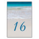 Votos costeiros, cartões de número da mesa de casamento de praia. Adicione o número individualmente a cada placa e ele aparecerá em ambos os lados. Vertical com cena de praia e água turquesa tropical em ambos os lados.