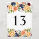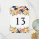 Cartões de Número de Tabela Floral de Casamento de Queda Personalizada. Design apresenta lindas flores aquáticas em tons de laranja amarelo, pêssego, azul e vermelho-burgundy com acentos verdes. O texto do número da tabela preta deve ser personalizado para cada número necessário.