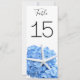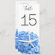Cartões de números de mesas de jardim azul alto. Cartões duplos de 4 x 9 polegadas têm texto preto e flores azuis grandes com design de estrelas. Altere facilmente o número de cada placa e ele aparecerá em ambos os lados. Belos cartões altos irão decorar elegantemente mesas de recepção e ajudar os hóspedes a encontrar seus assentos em qualquer evento de verão litoral, praia ou ao ar livre.