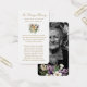 Fotofloral/memorial/cartões de oração elegantes com cruz de ouro e um arranjo floral com orquídeas brancas, flores roxas e verde. Um cheio sangrou foto com flores no fundo. Modelo totalmente personalizável.