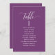 Ajude seus convidados a encontrar sua mesa com este elegante cartão moderno de assentos com nomes de convidados. Cartões duplos para que os hóspedes possam procurar os dois, frente ou verso pelos seus nomes. Espaço livre ao redor, dando-lhe a liberdade de usar clipes ou furos de perfuração para monitores suspensos, ou usar o suporte/quadro da mesa. Púrpura e texto branco. Detalhes da caligrafia escrita à mão. Várias opções de cores. Ter todos os números de tabela na mesma cor ou cores misturadas de acordo com o tema de cor do evento.