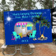 Cartões de Natal tropicais. Uma cena noturna tropical com palmeiras ao lado de um pequeno trailer viagem prateado é a imagem com saudação e assinatura no topo. "Natal para acampamentos de Feliz" é o texto da amostra, com um lugar para o ano na parte inferior do cartão. O texto é aqua azul brilhante em uma fonte moderna e impressa. O céu noturno tem uma grande estrela brilhante com outros brilhando. As duas palmeiras estão cortadas em uma corda de luzes e uma fogueira queima embaixo delas. As aparas brilhantemente coloridas, os flamingos plásticos cor-de-rosa e um pequeno acabamento de concha do tema tropical.