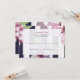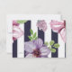 Um cartão-resposta moderno e elegante com listras brancas e azuis escuras em negrito sobrepostas com flores.