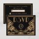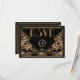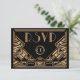 Um cartão de resposta de RSVP de casamento ousado e elegante, com estilo vintage e tema "Great Gatsby" dos anos vinte em tons de preto e dourado. Um fundo preto destaca a intrincada borda geométrica no estilo Art Deco em tons de bege dourado. Fontes decorativas de época foram selecionadas para completar o visual.