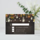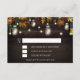 Cartões de RSVP de Casamento em Pote de Pedra com Luzes de Outono Rústico - apresenta um fundo de madeira de celeiro rústico com folhas de bordo, carvalho e outras folhas em cores de outono -- vermelho, borgonha, amarelo, verde e laranja com luzes cintilantes por toda parte. Potes de pedra cheios de luzes ou vagalumes também são adicionados ao design.