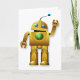 Robôs podem ser amigáveis como esta design prova. Este design é um robô amigável que está parado e acenando. O robô é dourado e tem um botão verde no peito e olhos verdes. Este design de robô amigável parece excelente nestas placas de saudação