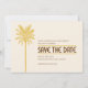 Cartões de save the date de praia tropical bege, marrom e branco com design de palmeira.