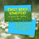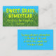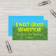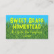 Cartões de visita de grama verde e céu azul com texto em negrito. Mantenha simples com o nome da fazenda ou empresa em uma fonte impressa divertida. Use uma ou duas linhas. Abaixo do nome, adicione mais uma ou duas linhas, com localização e contato ou outros. No verso, use o modelo para adicionar mais informações, se necessário. Remova todo o texto para deixar o verso em branco. As cores são azul aqua, verde grama e chartreuse.