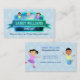 cartão de visita muito profissional, colorido e alegre. Tons azuis vibrantes são cores complementares com logotipo infantil. Dê uma primeira impressão de excelente ao procurar clientes para o serviço de seus filhos. Imprima os pais com este cartão de visita lindo. Seja você uma babá, babá, cuidadora, pré-escola, creche ou mais, esse design colorida e alegre vai impressionar.