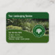 Ajardinando o modelo de cartão de negócios em um design poderoso com arbustos ajardinados, grama, e medalhão profissional ajardinando original que você pode personalizar em linha. Projetado para um landscaper, ajustador da árvore, serviço do gramado e apresentado em nosso tamanho do que padrão mais alto do estoque do cartão de visita do grande formato para o impacto visual.