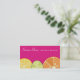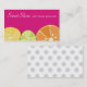 Os citrinos cortam cartões de visitas para o padeiro, o cozimento, a padaria, o cozinheiro chefe de pastelaria e o outro cozinheiro chefe pessoal ou privado, o fornecedor ou a restauração, o vendedor de comida ou o outro negócio culinário. Limão, limão, e fatias alaranjadas com sementes em um fundo do rosa quente.