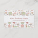 Um cartão de visita moderno, lustroso com os ícones dos utensílios de cozinhar assorted do cozinheiro chefe encontrados geralmente na cozinha arranjou em um teste padrão de repetição. Incluem artigos como a espátula, whisk, pino do rolo, concha, facas, potes e bandejas entre outros. O design é serido para negócios na comida e a bebida como restaurantes, cafés, cozinheiros chefe e cozinheiros pessoais, padarias, pastelarias, jantar e negócios de restauração. Personalize facilmente com seus detalhes do negócio.