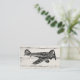 Um avião vintage legal sobre um fundo branco de madeira, com texto vermelho e branco.