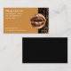 Cartões de visitas clássicos de beleza e maquiagem desenhados com um emblema de batom dourado e gráfico decorativo de confetti coordenado por cores. Um cartão de chamada de tendências para um Artista Makeup, Cosmetics ou Beautician, ou representante de vendas de cosméticos. Entregue seus cartões de visita em estilo.
