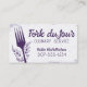 Comer, jantar com cartões de visitas de arco para cozinheiros pessoais ou privados, restauração ou catering, classes de cozinhar ou instrução culinária; em cinzentos e roxos com fundo de linho arranhado e espirais decorativas.