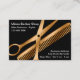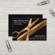 Cartões de visitas de compro de barbearia clássicos, porém simples, projetados com recorte de tom dourado rasga gráficos e um pente estiloso em um layout de cartão de chamada genérico que você pode personalizar on-line neste modelo editável.