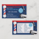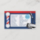 Design de cartão de visita único para barbeador e barbearia que exibe polo de barbeiro e clipes. Exibindo também as cores tradicionais da barbearia azul, vermelha e branca, este cartão tem a lista de serviços de barbearia que são personalizáveis. Toda a trabalho de arte foi criada e ilustrada por Dale Arthur, de whizcreations.com.