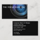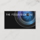 Cartão de visita de fotografia com imagem de uma lente de câmara num design moderno, inteligente, com dois lados com área de texto que pode personalizar. Use este modelo de cartão de negócios de fotografia para um fotógrafo, videógrafo ou fotógrafo.