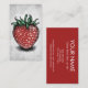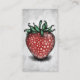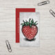 Cartão de visita de morango branco apresentando um morango bolinhas em vermelho, verde e branco sobre uma cinza malhada.