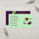 Estas belas cartões de visitas de vinho apresentam uma amável taça de vinho tinto, uvas e corações verdes! Estes cartões de visitas são uma maneira criativa de impressionar e são excelentes de usar como cartões de contato pessoais! Preencha o seu próprio nome, endereço, correio eletrônico, número de telefone e Web site ou quaisquer outras informações de que necessite para preencher facilmente o modelo personalizável! Perfeito para um amante do vinho, adega, cervejaria, restaurante, cozinheiro, cozinheiro ou qualquer pessoa que possa apreciar arte original elegante!