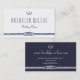 Cartões de visitas náuticas de planejador de casamento com folha frontal branca e folha traseira e âncora azuis, impressas em fundo azul com padrão de âncora