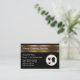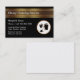 Serviço clássico de limpeza residencial ou comercial cartão de visita com um emblema de limpeza preto e dourado que tem uma lata de lixo, uma máquina de limpeza de chão e luvas de limpeza junto com um layout simples projetado para ser personalizado on-line. Um olhar em alta escala sobre um orçamento impresso em estoque de papel de alta qualidade que é mais alto do que o padrão diz também, ou seja, cartões de visitas de tamanho de euro.