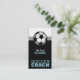 Cartões de visitas verticais modernos de treinador projetados com uma grande bola de futebol no topo do lado frontal e todos os detalhes de contato em texto branco e azul sobre preto.