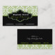 O damasco branco verde preto interioriza a cartão de visita, apresentando uma cor damasco verde e branca. A parte inferior é de cor preta sólida. Uma faixa preta e verde separam as duas partes. Sua empresa/nome é digitado em um quadro preto elegante com contorno branco e verde.