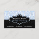 O damasco branco azul preto atravessa a cartão de visita, apresentando uma cor damasco azul e branca. A parte inferior é de cor preta sólida. Uma faixa preta e azul separa as duas partes. Sua empresa/nome é digitado em um quadro preto elegante com contorno branco e azul.
