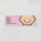 Este cartão de visita magro bonito é o acessório social perfeito para você e sua criança! Seu tamanho magro dobra facilmente afastado seu saco da fralda, trouxa do miúdo ou bolsa. O ideal para compartilhar da informação da sua criança ao arranjar o jogo data, sleepovers, ou apenas factura de amigos novos. Estes cartões bonitos caracterizam uma ilustração lunática da cara de um bebê na frente de um fundo cor-de-rosa. E o melhor de tudo, cada cartão de visita é inteiramente customizável. Comece personalizar agora!