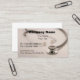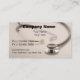 Cartões de visitas médicos com foto de um estetoscópio e layout de texto que você pode personalizar online. Com um dispositivo médico no modelo funcionaria bem para um médico, um serviço de suprimentos médicos ou um representante da companhia de seguros de saúde.