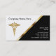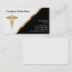 Cartões de visitas médicos com design moderno que inclui um símbolo médico de cor dourada, linha geométrica com aparência elegante, um simples design cartão de visita que o vamos personaliza e muda a cor preta de fundo, se quiser. Eu desenhei este modelo de cartão de negócios como um design único e moderno para um profissional de saúde, clínica médica ou qualquer negócio da indústria de saúde.