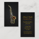 Cartões de visitas ilustrados para leitores ou instrutores de saxofone; design de música negra e ouro com ilustração do contorno de saxofone; O design é personalizado com campos de texto personalizáveis para adicionar seu nome, negócios, endereço e outras informações